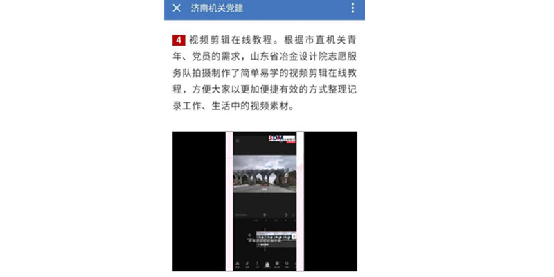4月1日,為貫徹市直機(jī)關(guān)青年志愿“區(qū)塊鏈”項(xiàng)目部署,公司團(tuán)委積極組建青年志愿服務(wù)隊(duì),結(jié)合市直機(jī)關(guān)廣大黨員、青年掌握簡(jiǎn)易視頻剪輯的需要,第三團(tuán)支部、第六團(tuán)支部團(tuán)員青年迅速行動(dòng)制作了電腦端視頻剪輯教程和手機(jī)端視頻剪輯教程,該志愿服務(wù)項(xiàng)目得到了市直機(jī)關(guān)團(tuán)工委充分認(rèn)可,并在濟(jì)南機(jī)關(guān)黨建平臺(tái)予以推廣。