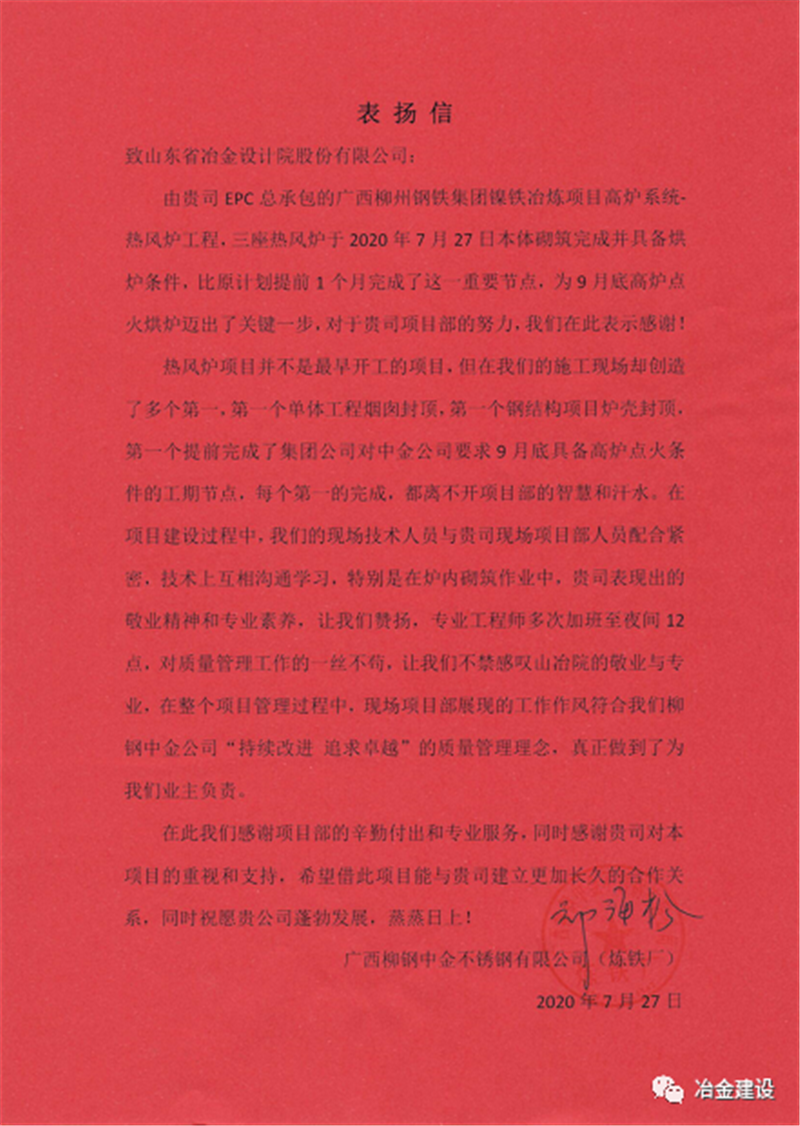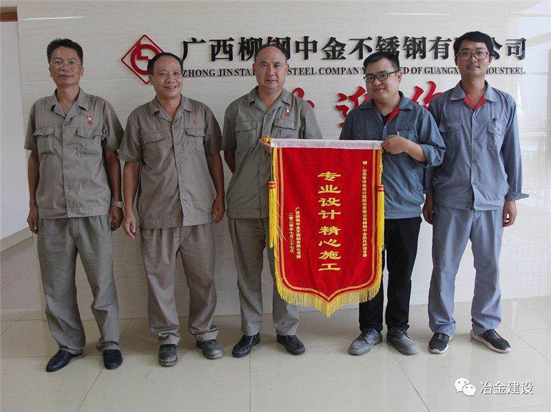 就是憑著這股韌勁和山冶設(shè)計(jì)“敢打硬仗、一切為用戶著想”的精神,柳鋼中金熱風(fēng)爐工程的各項(xiàng)工作推進(jìn)順利,并多次在安全、質(zhì)量、進(jìn)度大例會上受到表揚(yáng)。在27日砌筑封頂之后,上午柳鋼中金煉鐵廠送來表揚(yáng)信,對現(xiàn)場項(xiàng)目部的工作給予了肯定,下午柳鋼中金公司副總經(jīng)理張洪波授予了現(xiàn)場項(xiàng)目部“專業(yè)設(shè)計(jì)精心施工”的錦旗,盛贊山冶設(shè)計(jì)專業(yè)、敬業(yè)!