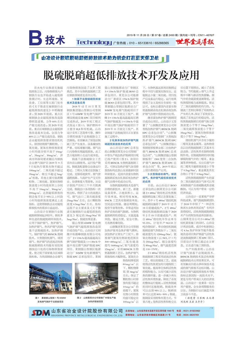 山冶設計脫硫脫硝超低排放技術助力鋼企打贏藍天保衛戰——脫硫脫硝超低排放技術開發及應用